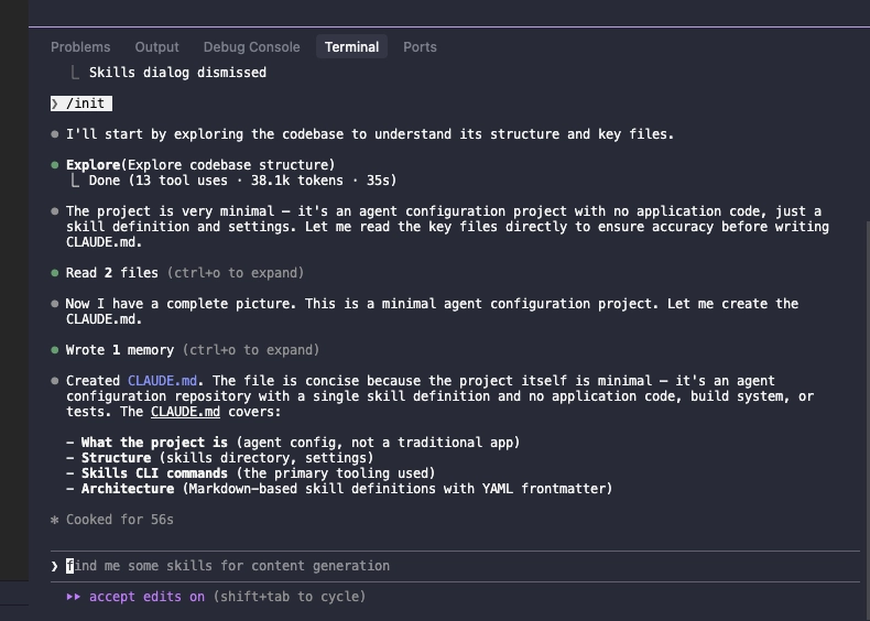 This will create a .claude folder with a configuration file about this project. It will have all the settings for Claude.