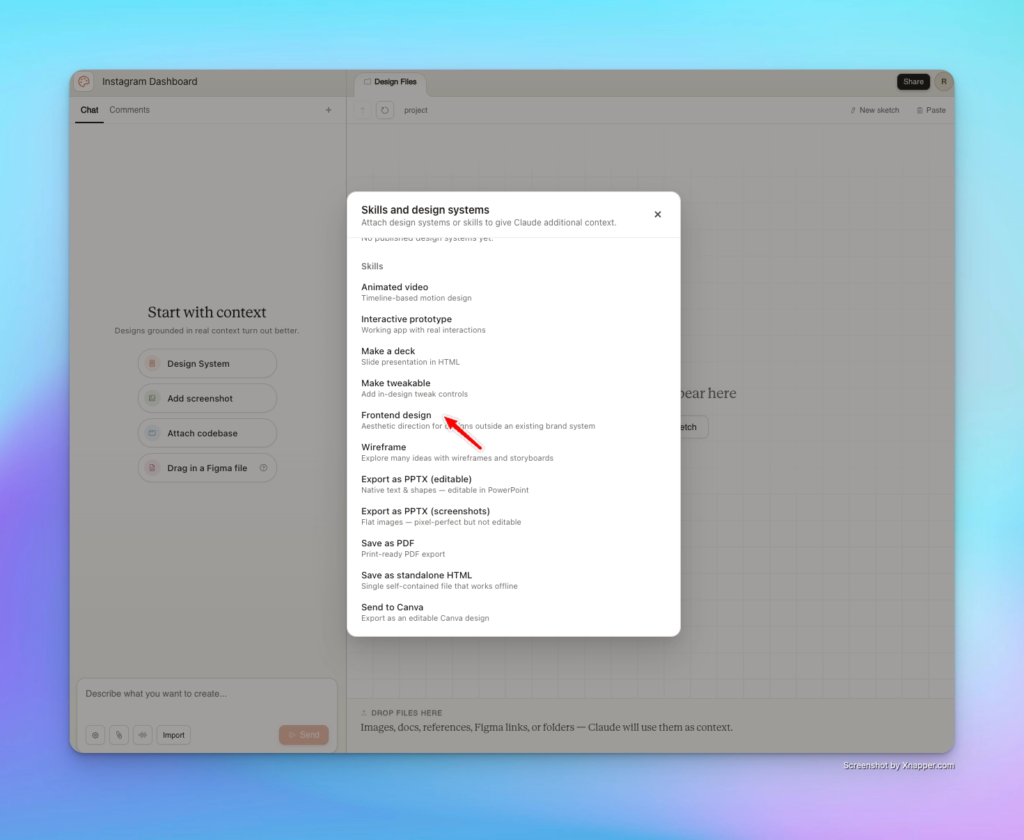Start a new project and select your design system. Make sure you select the “Frontend design” skill. This explicitly tells the AI to prioritize visual hierarchy and UI best practices.