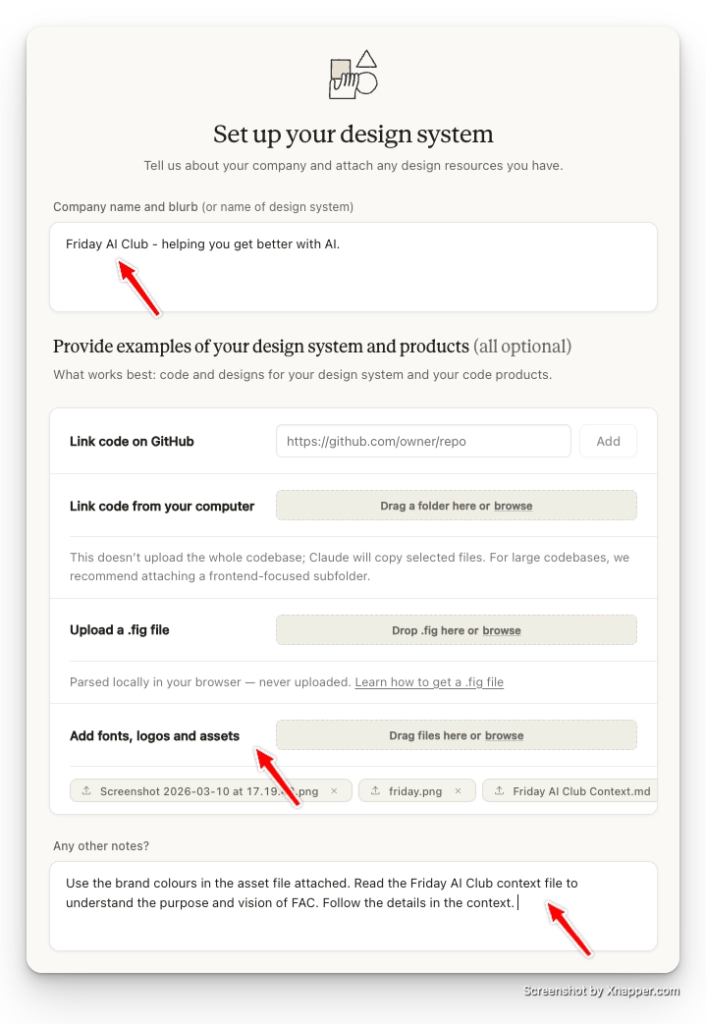 If you don’t have a Figma file or GitHub repo, leave those fields blank. The color book, logo, and font are the parts that actually matter.